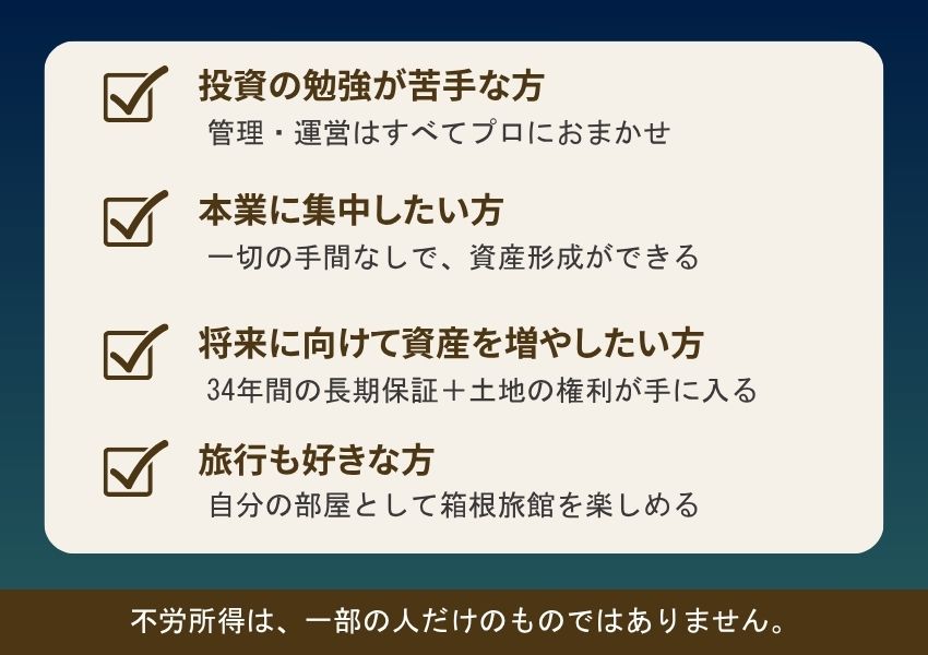 これは、箱根の高級旅館の一室を所有しながら、宿泊しなかった日は自動的に収益が発生するという、今注目の新しい不動産投資の形です。