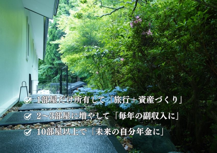76万円から旅館の一室を所有しながら、宿泊も収益も叶う仕組みです。