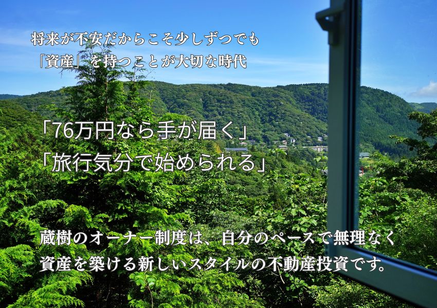 蔵樹のオーナー制度は、自分のペースで無理なく資産を築ける新しいスタイルの不動産投資です。